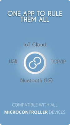CREATE GUI THE EASY WAY: Use any embedded device (based on Arduino, STM32, PIC, Raspberry PI, etc.) to create flexible, high-end graphical user interfaces. Simple protocol allows you to control devices over WiFi, Mobile network, Bluetooth (LE) or USB.